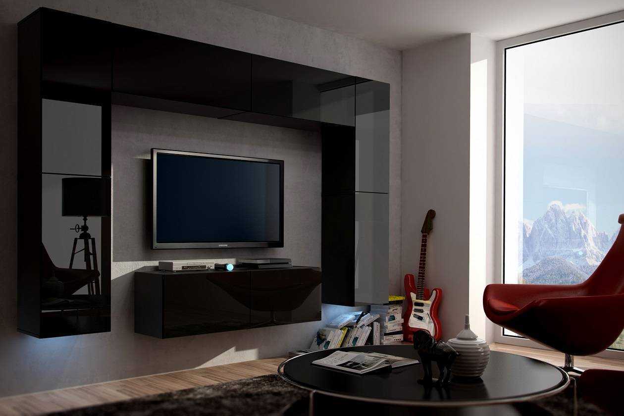 В качестве подставки под телевизор выбирают напольную тумбочку или стойку. Можно использовать стеллажную полку, если позволяют размеры. В современных интерьерах домашний кинотеатр подвешивают к стене.