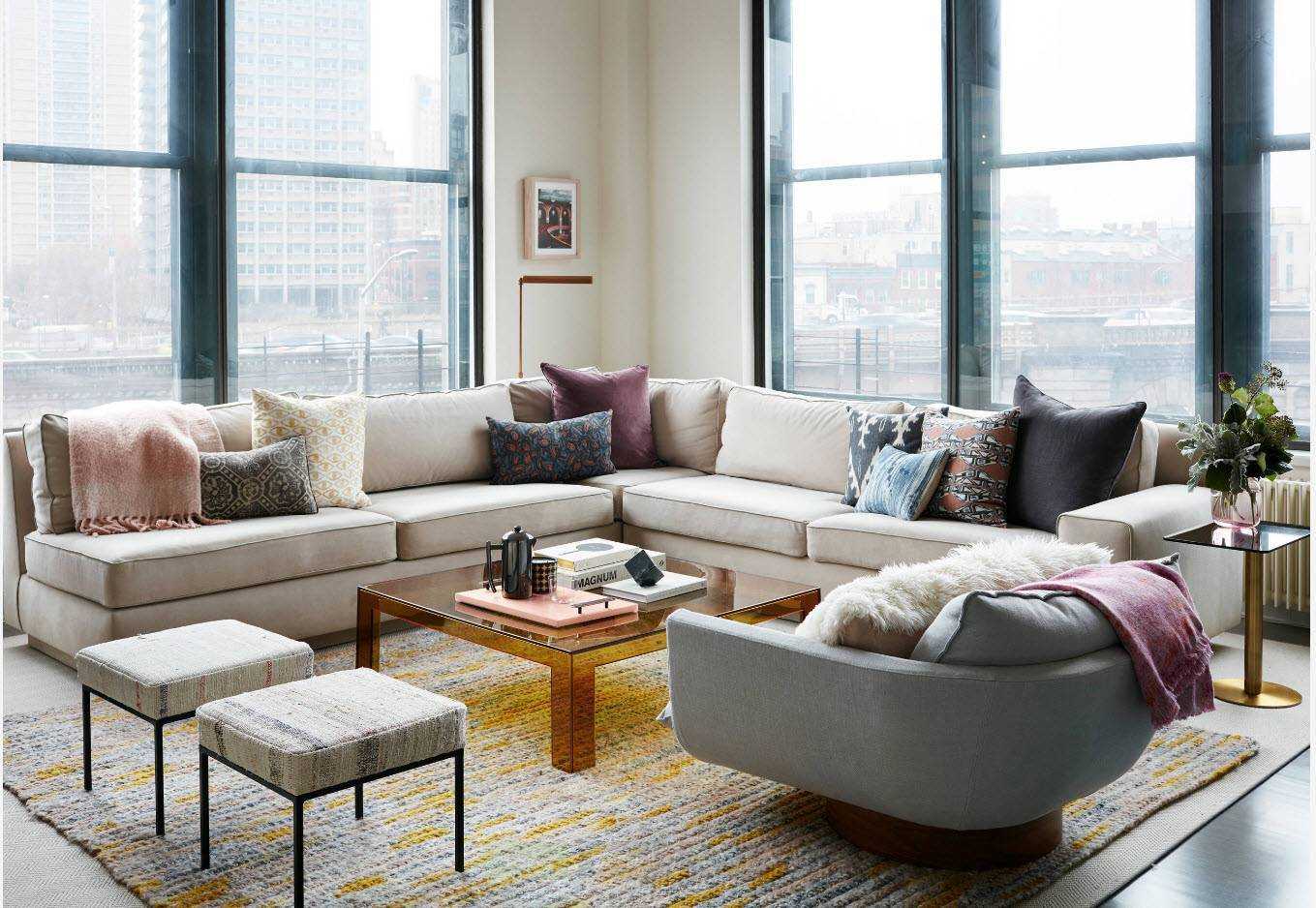 Подобная схема размещения мебели в гостиной подойдёт для маленьких и больших пространств в современном стиле. Но особенно хорошо она выглядит в нестандартных помещений, потому что маскирует недостатки планировки.