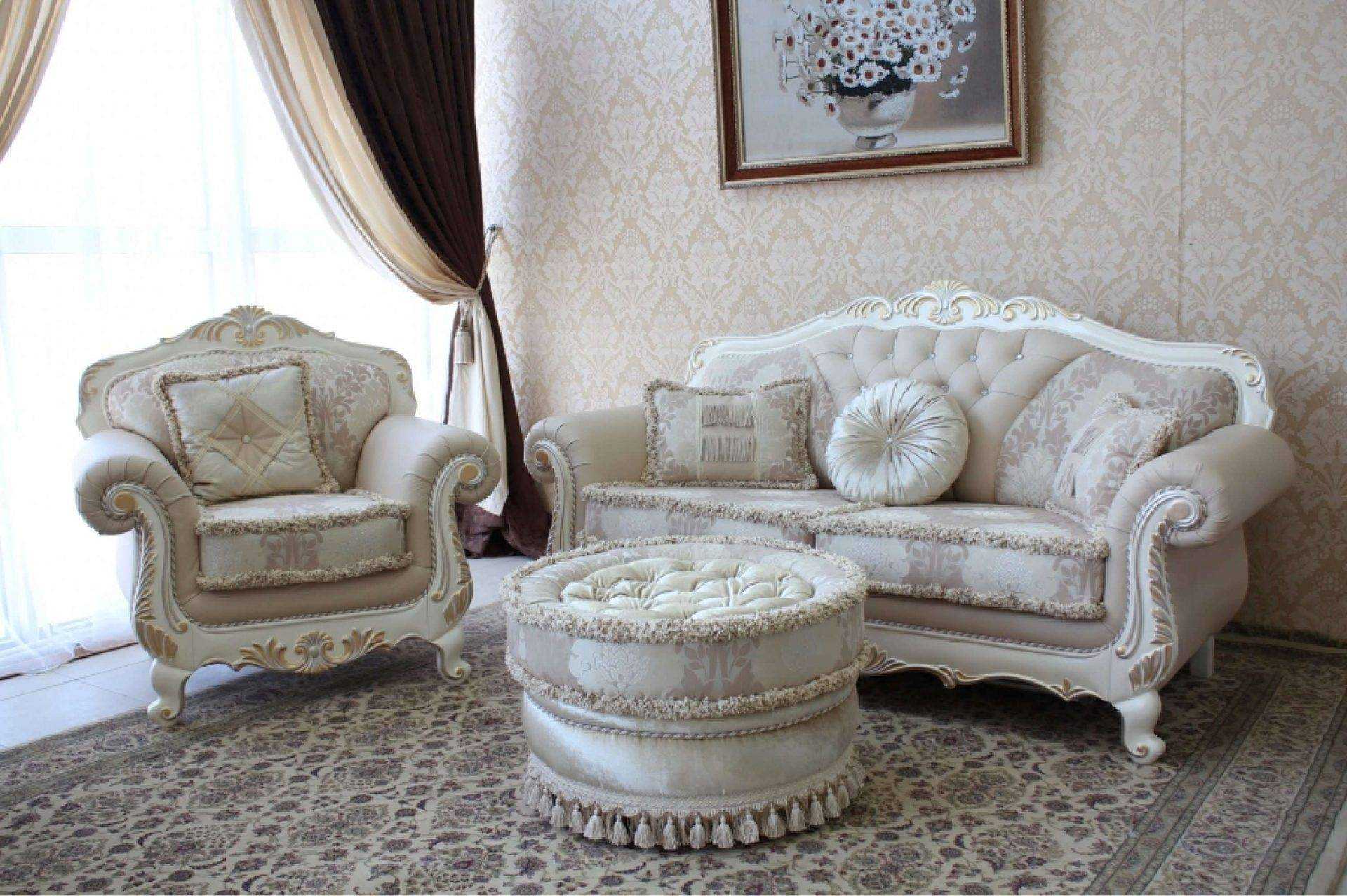 Рядом с диваном размещают пуфики, кресла