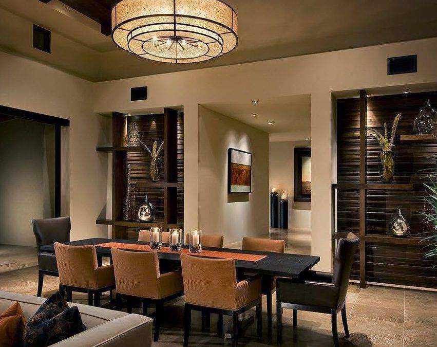 Обеденную зону лучше оформлять ближе к двери, чтобы удобнее было накрывать стол. Если комната маленькая, можно у одной из стен поставить стол-трансформер. Его используют по мере необходимости, переставив на время в центр гостиной.
