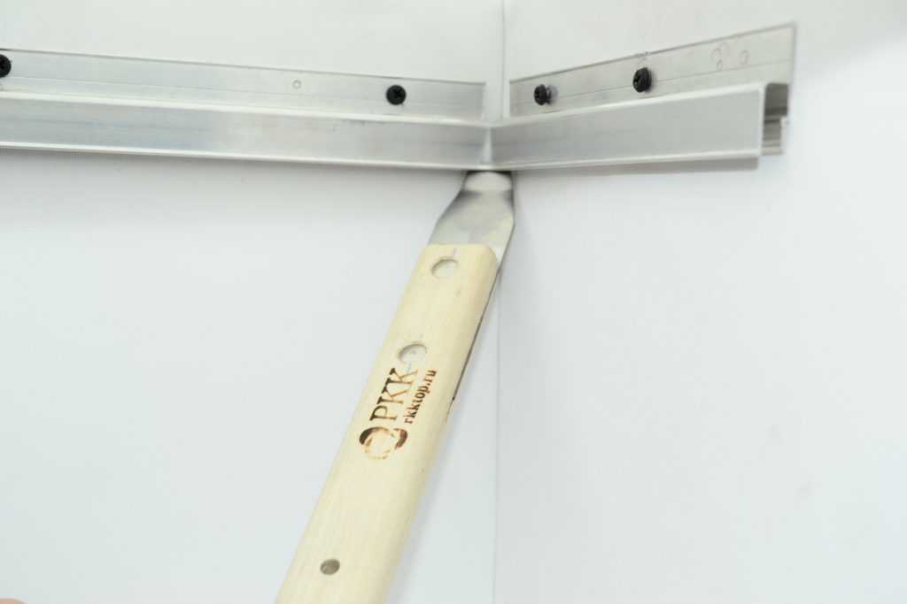 - После нагрева материал заталкивается под клипсы с применением специальных лопаток для натяжных потолочных конструкций, которые продаются в наборах.