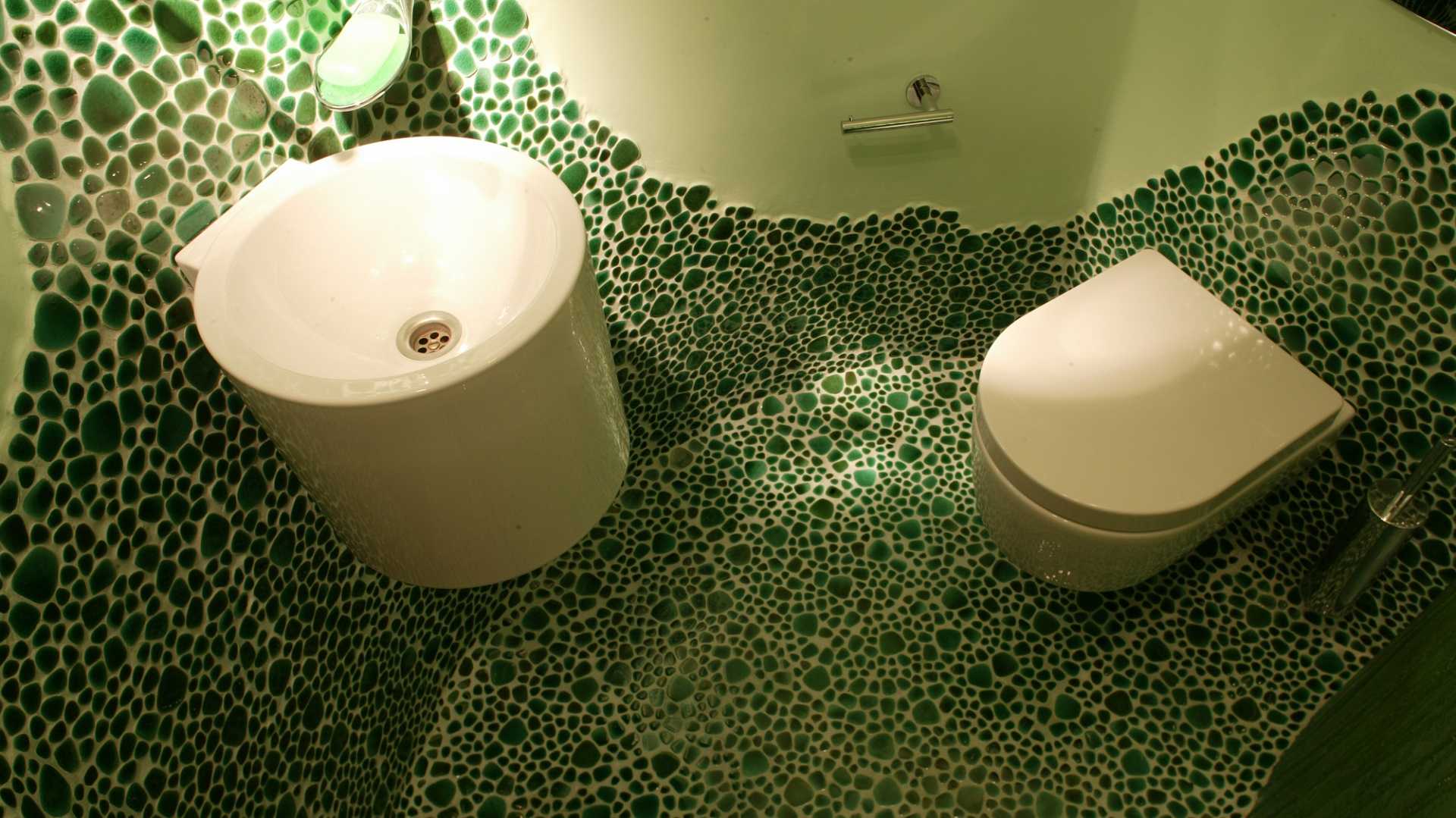Интересный фактурный материал. Галька также применяется в небольшом туалете фрагментарно. Она сочетается с другими материалами, которые будут иметь однотонную окраску. И, желательно, имеющими гладкую структуру.
