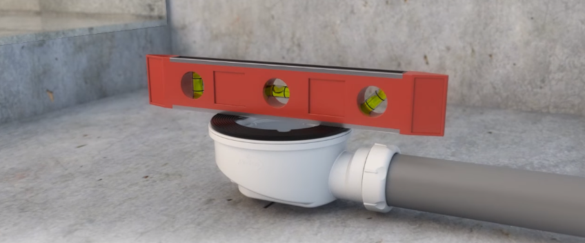 - Поддон устанавливается на основание. Замеряется высота сливного отверстия (над полом). Проверяется соблюдение уклона выводной трубы: уклон линии от сливного до канализационного отверстия должен составлять 5-6 сантиметров на метр. Если условие не выполняется, раковину душа нужно поднять на недостающую высоту. Высота пространства под раковиной для установки затворной арматуры не должна быть меньше 8 см. При правильной установке раковины, поддон снимается. Переходят к монтажу сифона.
