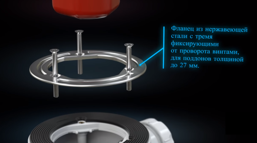 Следующим этапом является установка поддона, который должен плотно прилегать к стене и устойчиво располагаться на полу. Его нижний борт фиксируется к клеммам на стенах. Затем на корпус сифона укладывается резиновая прокладка. На ее поверхность следует нанести слой герметика. Корпус устройства одной рукой прижимается к нижней части поддона. Сверху укладывается металлическое кольцо, которое фиксируется болтами. Их следует зажимать поочередно во избежание перекосов.
