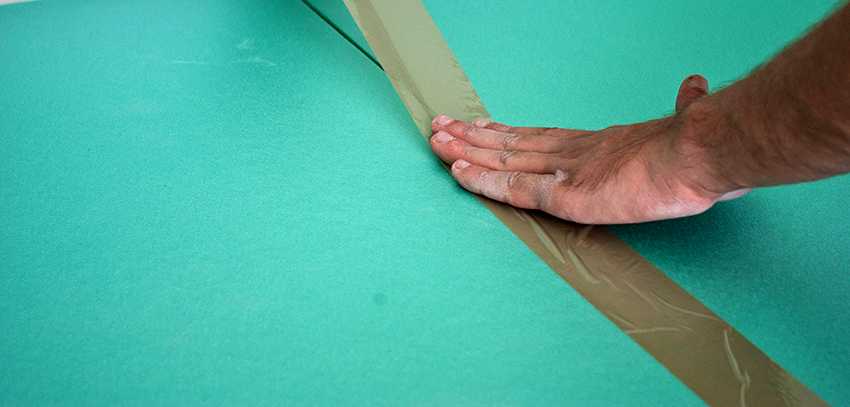 - Настил подложки. Рулонный материал стелют полосами без нахлестов – встык, потом их соединяют герметиком или специальным скотчем.