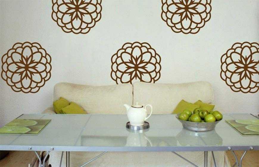 В одной комнате можно использовать один тип орнамента. На кухне и в гостиной хорошо применять трафареты цветов и зелени, которые будут подчеркивать радушную атмосферу. При этом с цветами нельзя сочетать дамасский орнамент, поскольку он потеряет свое совершенство, роскошь. Не стоит комбинировать геометрические изображения с бабочками, животными и пр.