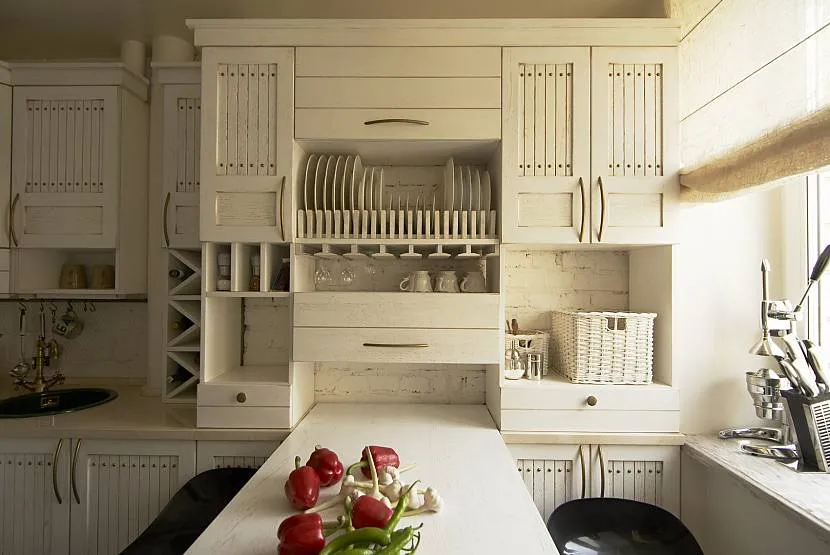 6. Стеклянные фасады или вовсе открытые полки сделают навесные шкафы менее громоздкими.