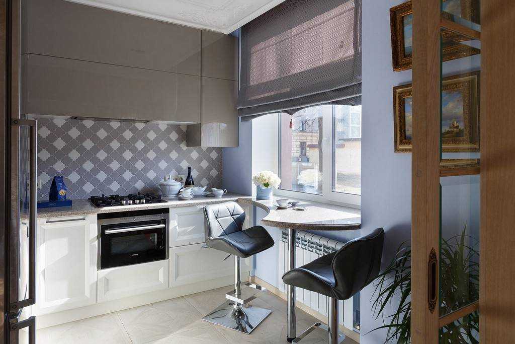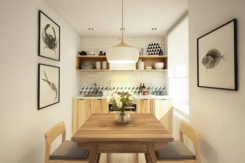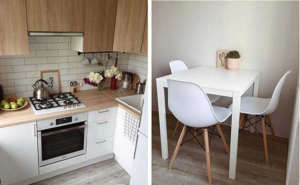 Идеальным вариантом станет барная стойка, навесная узкая столешница или мебель-трансформер. Подобное решение удобно, так как стол не занимает много места. В линейной и параллельной планировке лучшим местом для него является незанятая стенка с окном, где столешница заменяет собой подоконник. Если оставить достаточно свободного пространства между кухонным гарнитуром и перпендикулярной стенкой, можно удачно поместить маленький диванчик, оборудовав еще и зону отдыха. Даже в однорядной кухне можно с пользой использовать свободные стены, повесив съемную столешницу. И не нужно ставить громоздкие стулья: достаточно небольших табуреток, которые всегда можно спрятать под столик.