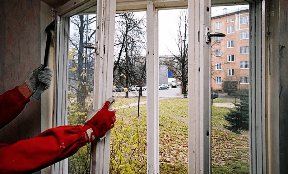 Из верхних петель створок при помощи отвёртки или плоскогубцев вынимают штифты (за них нужно браться снизу), после чего створки движением вверх снимают с петель. Из глухого окна нужно вынуть стеклопакет, поддев штапики ножом или шпателем.