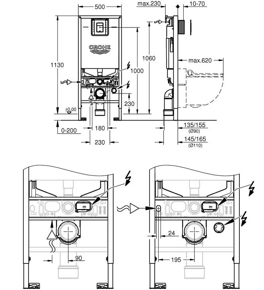 Как и опирающиеся на пол модели, унитазы с инсталляцией подключаются к канализации стандартным способом; кнопку спуска устанавливают на передней панели (иногда сверху).