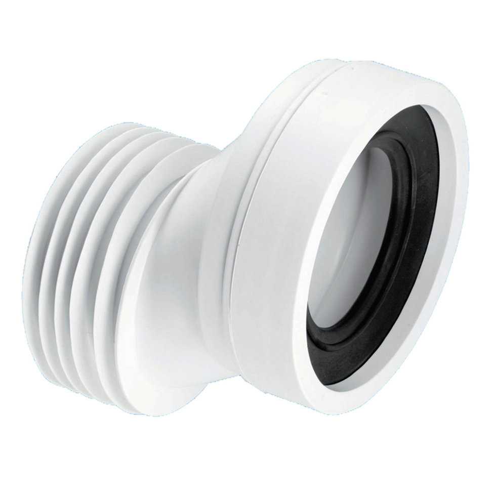 - эксцентрик. Это труба, одна часть которой смещена на 5 см относительно другой, и между ними реализован плавный переход. Применяется при несосном расположении выпуска прибора и патрубка стока, то есть когда установить унитаз точно напротив раструба нет возможности. Как и труба, эксцентрик является жестким и имеет гладкие стенки, потому нечистоты в нем не задерживаются;