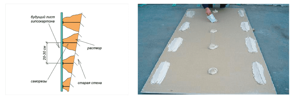 В некоторых случаях вместо полос раствор наносится на всю поверхность стены, а гипсокартон приклеивается к нему (но не поверх него — клей наносится на стену). Используется клеящая смесь:
